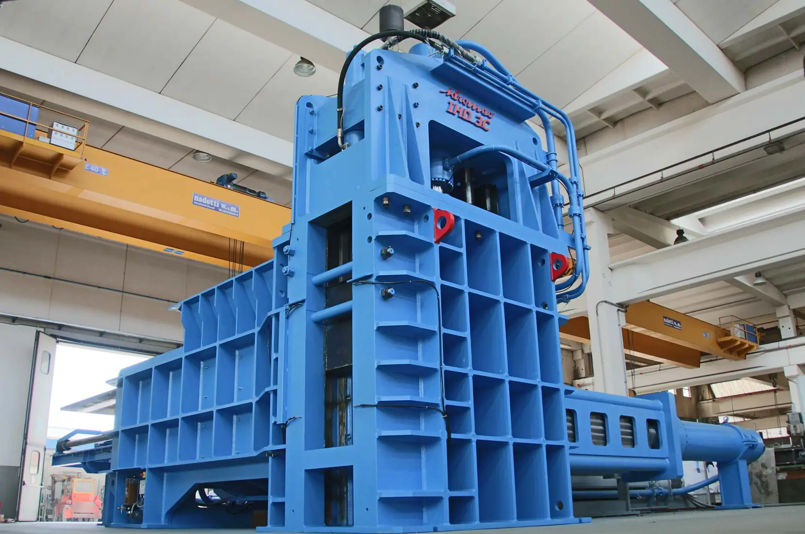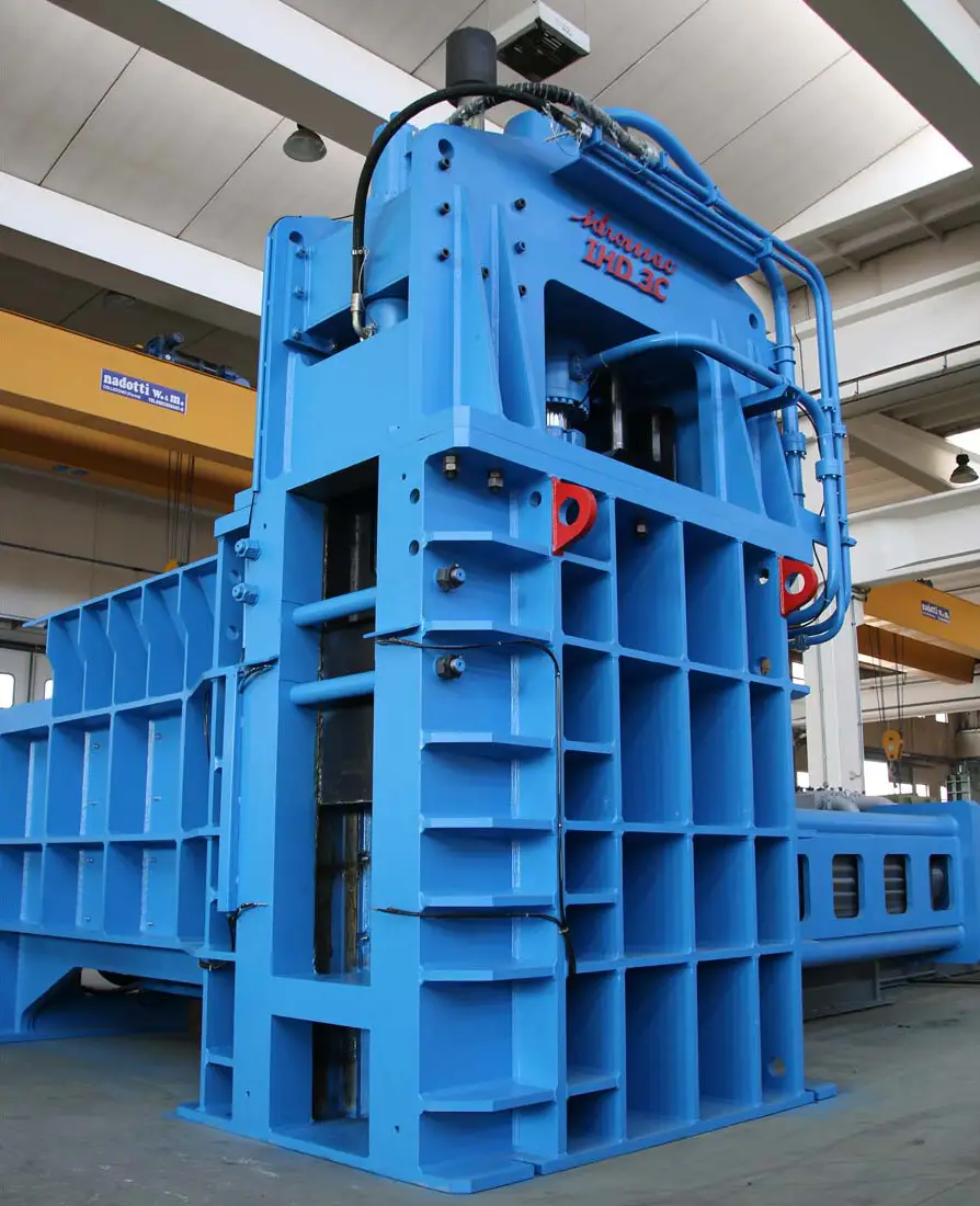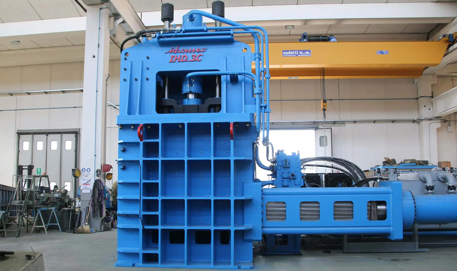 Erleben Sie die Idromec IHD-3C 5050 3-Wege-Schrottpresse bei der Arbeit. Sie verwandelt Metallschrott in hochdichte 500×500 mm Pakete. Kraft, Effizienz und Präzision in jedem Zyklus.